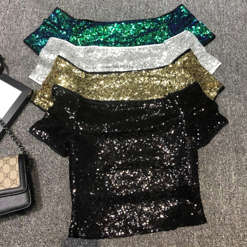 Sexy Shoulders A Word Sequins T-shirt Waist Coat Nightclub Stage Wind Short-slee